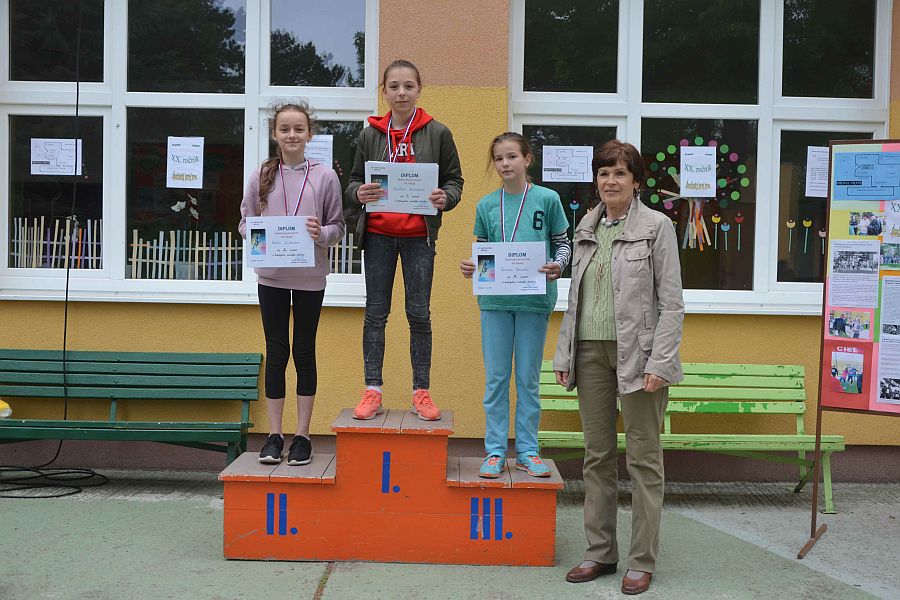 Foto: zdroj ZŠ s MŠ v Špačinciach (Majsterka Európy z budapeštianskeho leta 1966 Anka Chmelková a medailistky 20. ročníka Špačinského jarného krosu v kategórii mladších žiačok.)